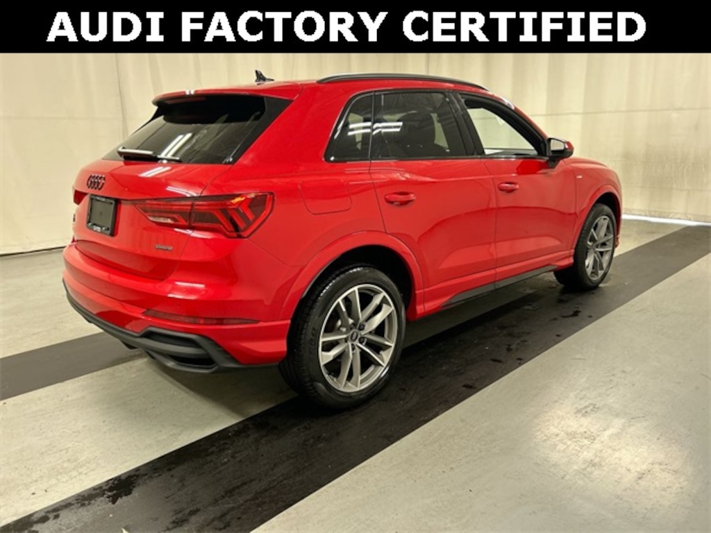 2025 Audi Q3 Premium S Line quattro 8-Speed Automatic with Tiptronic 2.0L 4-Cylinder TFSI Progressive Red w/ Black Interior & Black Optic Package, Heated Seats, Heated Mirrors, Panoramic Sunroof, Power Tailgate, LED Interior Lighting Package